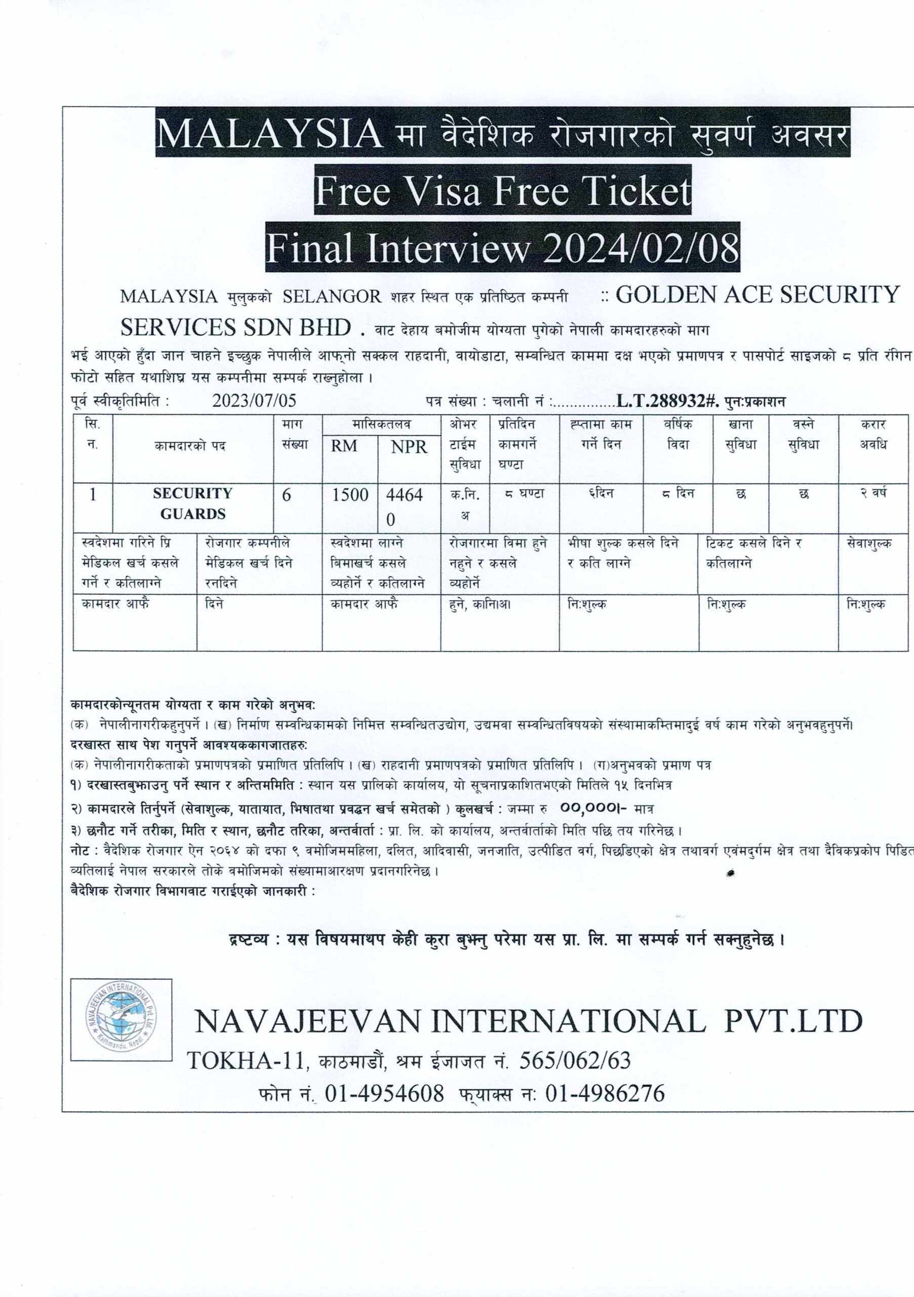 Navajeevan International Pvt. Ltd. One of the reputed and leading manpower agencies in Nepal. Our company Established in 2005 under the Company Act 2053 B.S.(1996 A.D.) of Nepal Government Registration No. 565/062/063 and Department of Foreign Employment. It was established by the leading experts in the field of recruitment service. Since the establishment, the company has gained vast experience in the field of recruitment which has enabled it to be one of the reputed companies in the country. Within a short period of time company has owned remarkable achievement and has ensured the total satisfaction of many renewed companies and organizations inside the country and overseas.